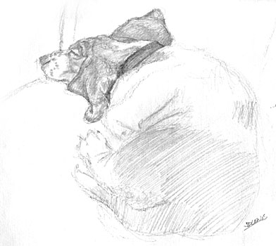 CORDELIA I was bored one night, and lying at the other end of the couch was my Bassett Hound, Corrie. I started drawing her, but then the rotten thing turned over on her back to have her belly rubbed. Some things are more important than art I guess (and yes, I did rub her belly) |