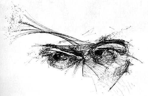 PEN STUDY This image began while I was absent-mindedly playing with a pen on a piece of paper while listening to a lecture. When I looked down, the first thing that jumped out at me was this pair of eyes. I doodled a little more, bringing them out, and this is the result |